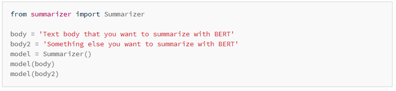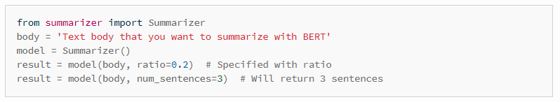 These examples have all been taken from the Bert Extractive Summarizer library, where you may find more complex examples and detailed documentation.
