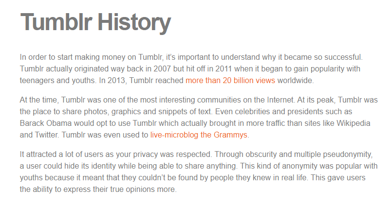 ‘In order to start making money on Tumblr, it’s important to understand why it became so successful. At its peak, Tumblr was the place to share photos, graphics and snippets of text.’