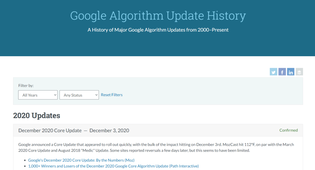 Moz keeps a list of all the major algorithm updates such as Google Page Experience and Panda algorithms. It includes the date they came into play and more details about the update.