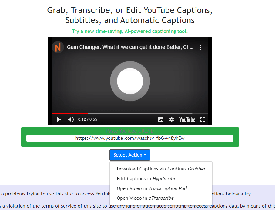 All you need to is paste the URL and then click on ‘Select Action’. Clicking ‘Download Captions…’ will immediately show the transcript text near your video.
